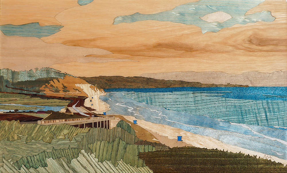 Mac Hillenbrand is a native San Diegan, now calling Carlsbad home. He first began his technique sanding decks and painting fences as a tradesman, later studying traditional marquetry wood inlay. A full-time working artist for the last seven years, with his own gallery, Hillenbrand’s biggest inspiration is the ocean and natural forms. His work is “designed to promote wonderment and contemplation of the cosmic parallels throughout nature.” He has had the honor of winning many awards including “Best of Show” recognitions, but “what makes a beautiful idea beautiful,” he says, “is the relief or reconciliation it yields its beholder.” www.amberwavesofgrain.gallery